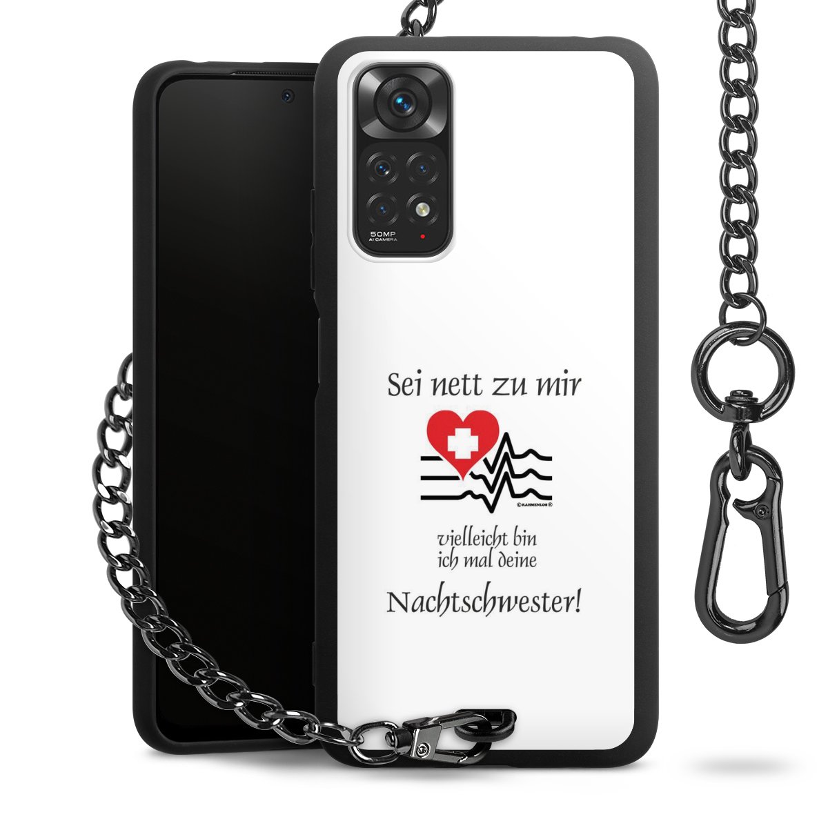Die mattschwarze Silikon-Handyhülle besteht aus robustem TPU (thermoplastisches Polyurethan). Sie ist flexibel und schützt Dein Smartphone vor Stößen und Kratzern. Die Kette sowie der Karabinerhaken sind aus Metall in Gunmetal-Optik gefertigt. Für dieses Produkt kommen ausschließlich TÜV-geprüfte Materialien zum Einsatz.