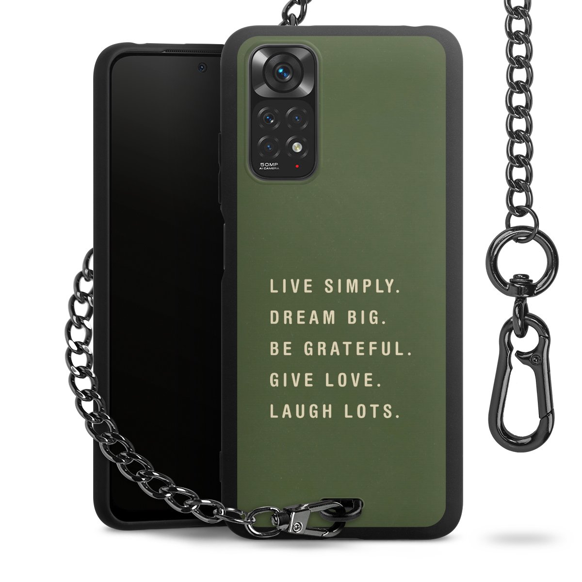 Die mattschwarze Silikon-Handyhülle besteht aus robustem TPU (thermoplastisches Polyurethan). Sie ist flexibel und schützt Dein Smartphone vor Stößen und Kratzern. Die Kette sowie der Karabinerhaken sind aus Metall in Gunmetal-Optik gefertigt. Für dieses Produkt kommen ausschließlich TÜV-geprüfte Materialien zum Einsatz.