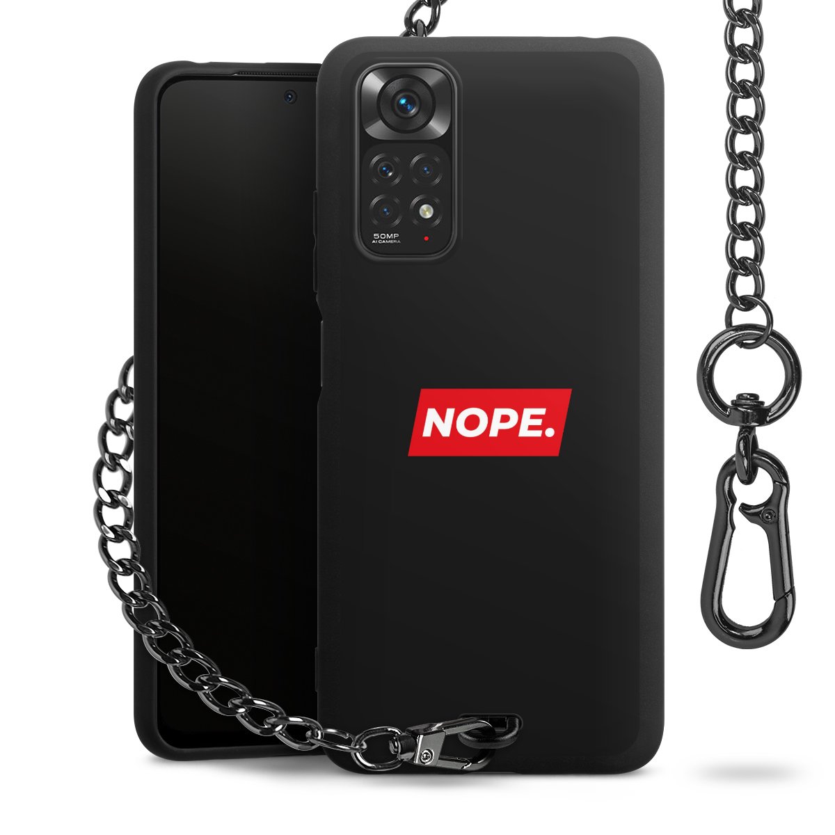 Die mattschwarze Silikon-Handyhülle besteht aus robustem TPU (thermoplastisches Polyurethan). Sie ist flexibel und schützt Dein Smartphone vor Stößen und Kratzern. Die Kette sowie der Karabinerhaken sind aus Metall in Gunmetal-Optik gefertigt. Für dieses Produkt kommen ausschließlich TÜV-geprüfte Materialien zum Einsatz.