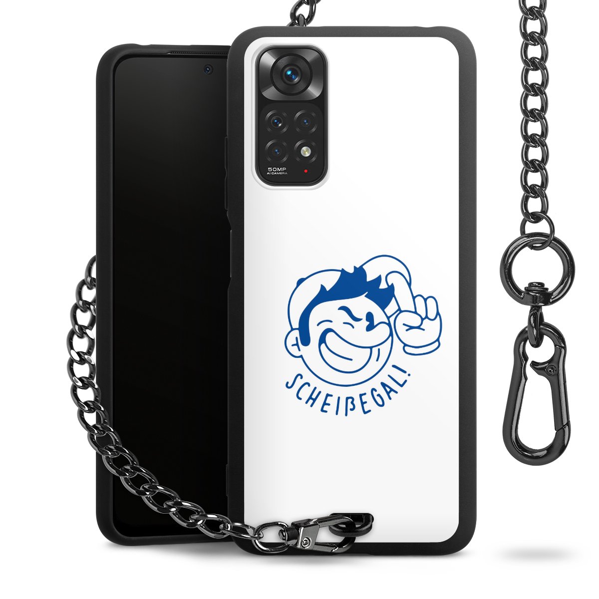 Die Handyhülle verfügt über eine mittig am unteren Rand platzierte Öse, an der die Metallkette stabil befestigt ist. Bestelle die Hülle einfach für Dein Smartphone-Modell, dann passt sie wie angegossen und Du brauchst sie bloß einmal anzudrücken. Handy in die Tasche, Karabiner an den Hosenbund – schon kann die Party starten.