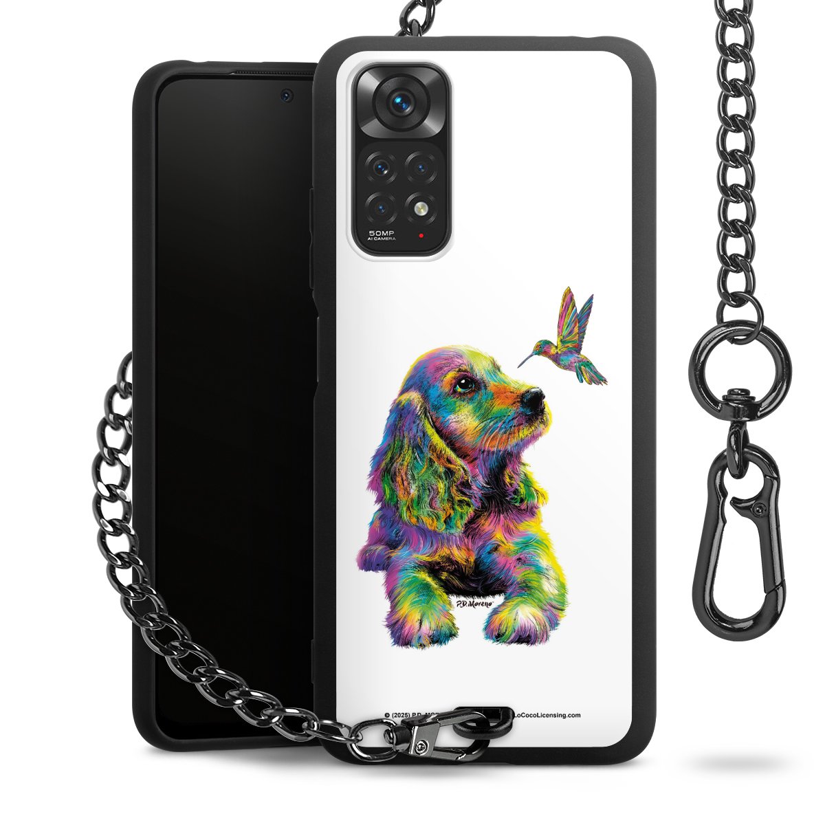 Die Handyhülle verfügt über eine mittig am unteren Rand platzierte Öse, an der die Metallkette stabil befestigt ist. Bestelle die Hülle einfach für Dein Smartphone-Modell, dann passt sie wie angegossen und Du brauchst sie bloß einmal anzudrücken. Handy in die Tasche, Karabiner an den Hosenbund – schon kann die Party starten.