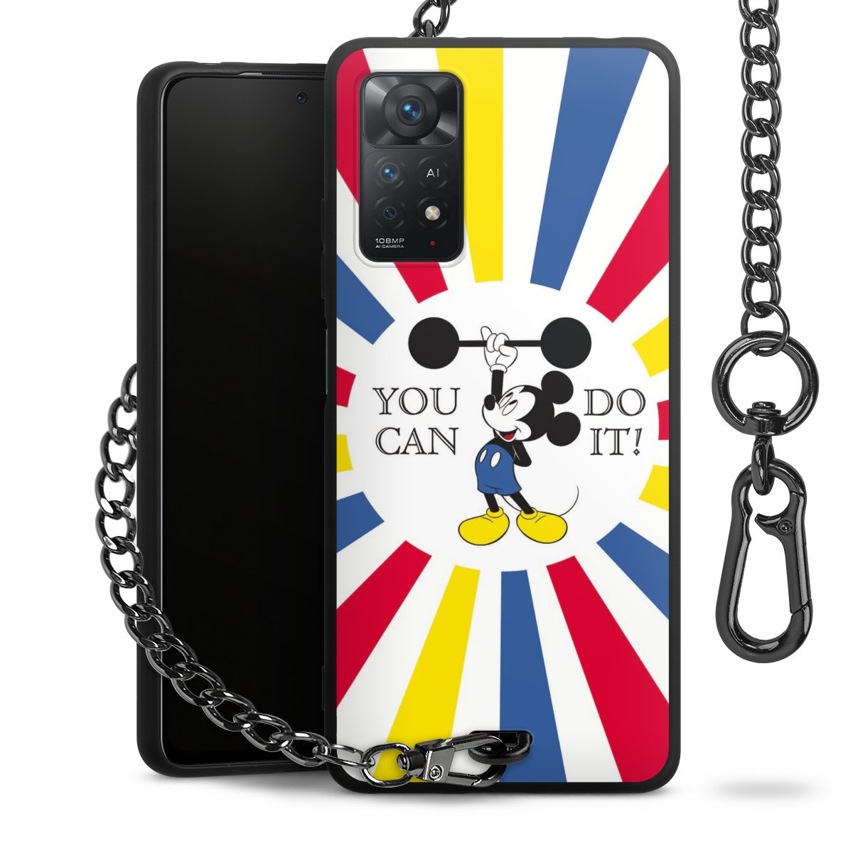 Die Handyhülle verfügt über eine mittig am unteren Rand platzierte Öse, an der die Metallkette stabil befestigt ist. Bestelle die Hülle einfach für Dein Smartphone-Modell, dann passt sie wie angegossen und Du brauchst sie bloß einmal anzudrücken. Handy in die Tasche, Karabiner an den Hosenbund – schon kann die Party starten.