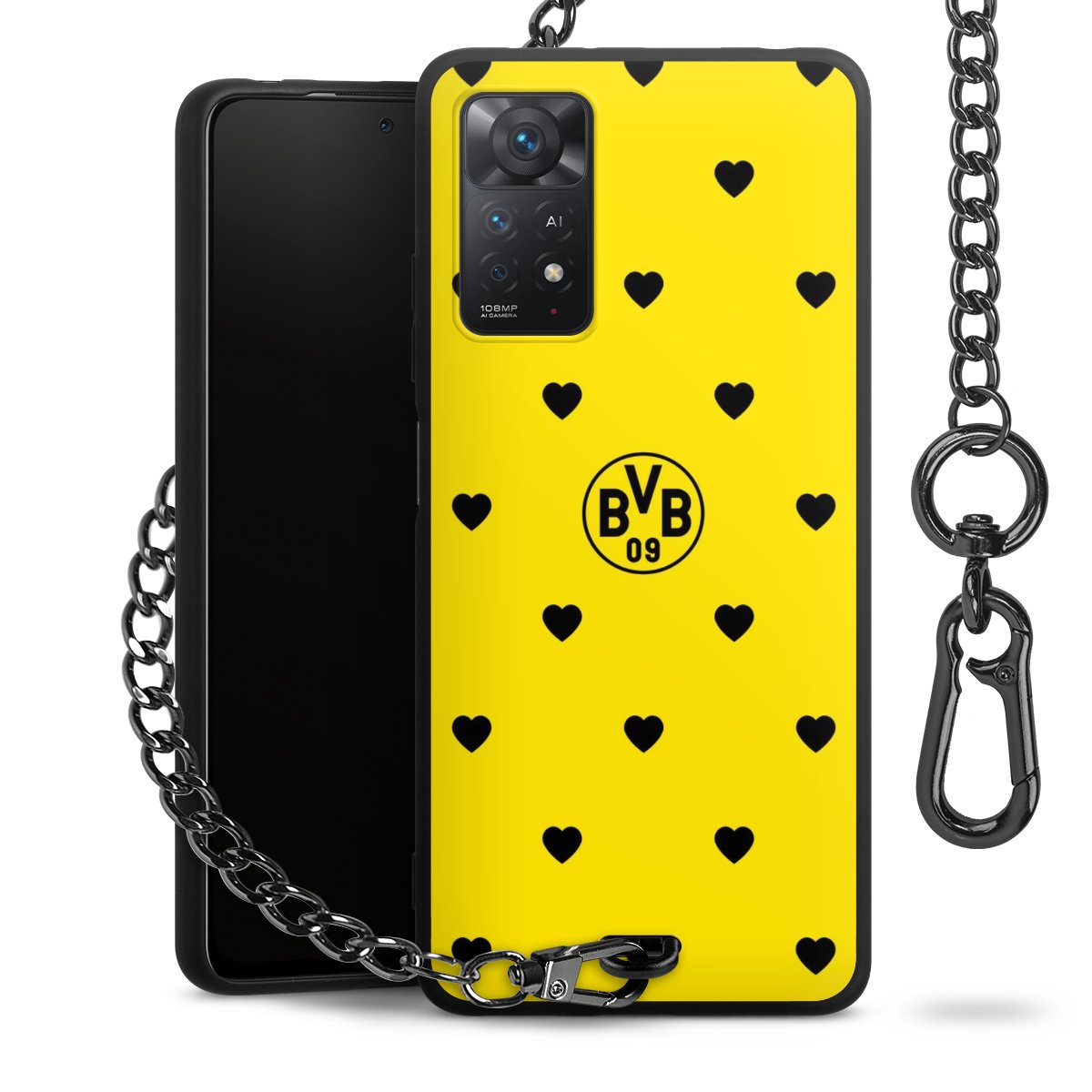 Die mattschwarze Silikon-Handyhülle besteht aus robustem TPU (thermoplastisches Polyurethan). Sie ist flexibel und schützt Dein Smartphone vor Stößen und Kratzern. Die Kette sowie der Karabinerhaken sind aus Metall in Gunmetal-Optik gefertigt. Für dieses Produkt kommen ausschließlich TÜV-geprüfte Materialien zum Einsatz.