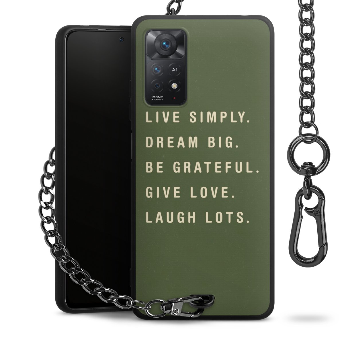 Die mattschwarze Silikon-Handyhülle besteht aus robustem TPU (thermoplastisches Polyurethan). Sie ist flexibel und schützt Dein Smartphone vor Stößen und Kratzern. Die Kette sowie der Karabinerhaken sind aus Metall in Gunmetal-Optik gefertigt. Für dieses Produkt kommen ausschließlich TÜV-geprüfte Materialien zum Einsatz.