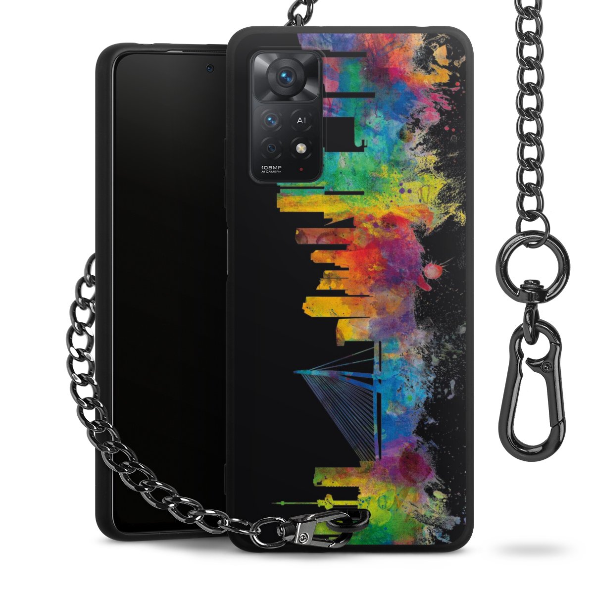 Die mattschwarze Silikon-Handyhülle besteht aus robustem TPU (thermoplastisches Polyurethan). Sie ist flexibel und schützt Dein Smartphone vor Stößen und Kratzern. Die Kette sowie der Karabinerhaken sind aus Metall in Gunmetal-Optik gefertigt. Für dieses Produkt kommen ausschließlich TÜV-geprüfte Materialien zum Einsatz.