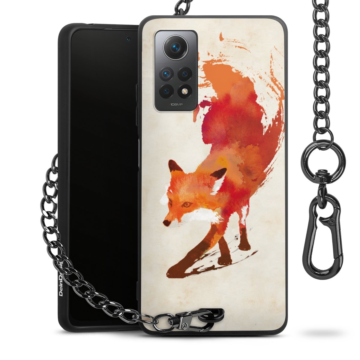 Die Handyhülle verfügt über eine mittig am unteren Rand platzierte Öse, an der die Metallkette stabil befestigt ist. Bestelle die Hülle einfach für Dein Smartphone-Modell, dann passt sie wie angegossen und Du brauchst sie bloß einmal anzudrücken. Handy in die Tasche, Karabiner an den Hosenbund – schon kann die Party starten.