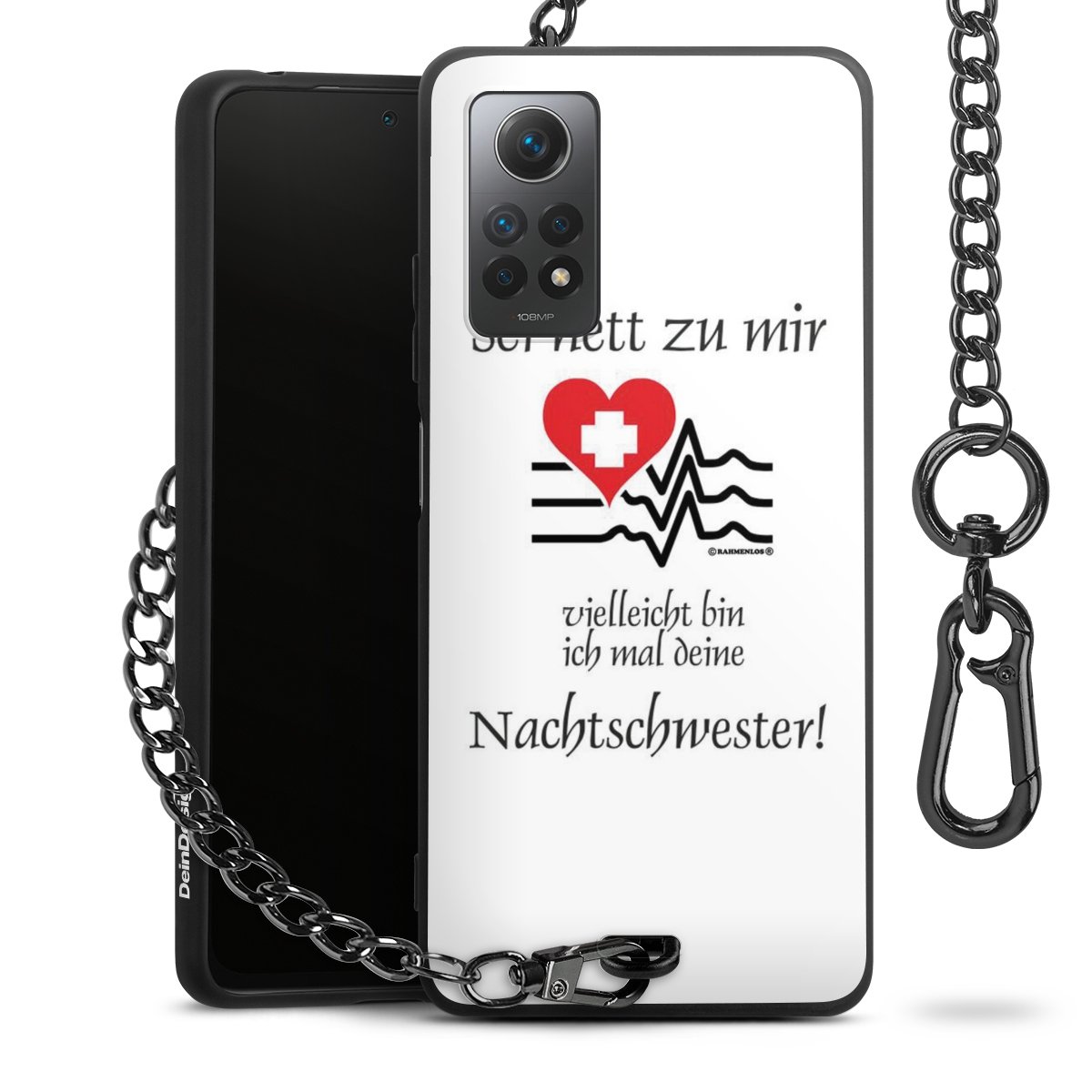 Die mattschwarze Silikon-Handyhülle besteht aus robustem TPU (thermoplastisches Polyurethan). Sie ist flexibel und schützt Dein Smartphone vor Stößen und Kratzern. Die Kette sowie der Karabinerhaken sind aus Metall in Gunmetal-Optik gefertigt. Für dieses Produkt kommen ausschließlich TÜV-geprüfte Materialien zum Einsatz.