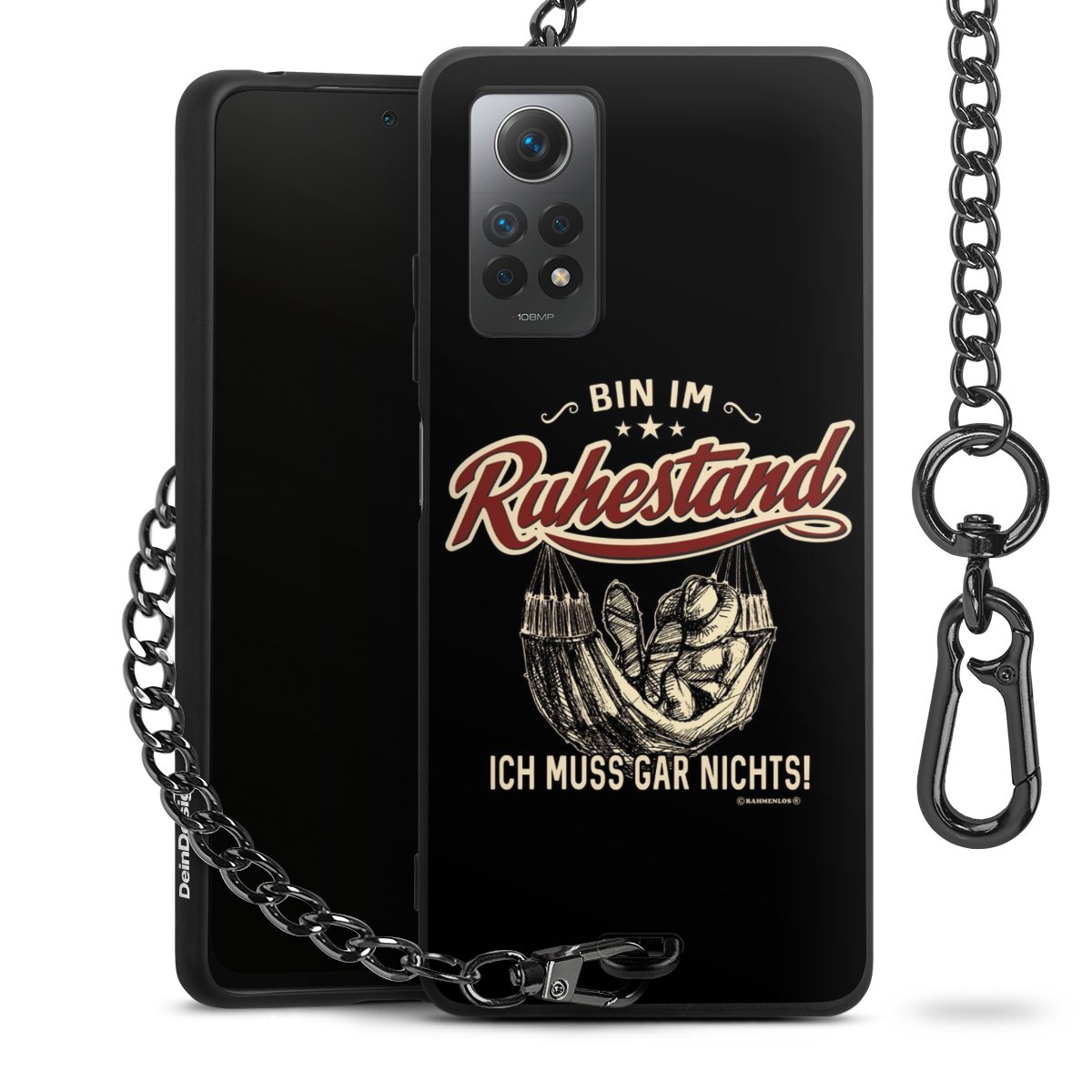 Die mattschwarze Silikon-Handyhülle besteht aus robustem TPU (thermoplastisches Polyurethan). Sie ist flexibel und schützt Dein Smartphone vor Stößen und Kratzern. Die Kette sowie der Karabinerhaken sind aus Metall in Gunmetal-Optik gefertigt. Für dieses Produkt kommen ausschließlich TÜV-geprüfte Materialien zum Einsatz.