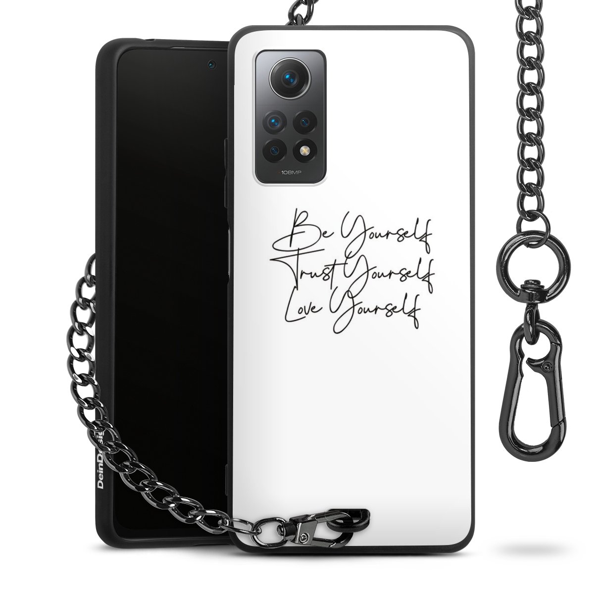 Die mattschwarze Silikon-Handyhülle besteht aus robustem TPU (thermoplastisches Polyurethan). Sie ist flexibel und schützt Dein Smartphone vor Stößen und Kratzern. Die Kette sowie der Karabinerhaken sind aus Metall in Gunmetal-Optik gefertigt. Für dieses Produkt kommen ausschließlich TÜV-geprüfte Materialien zum Einsatz.