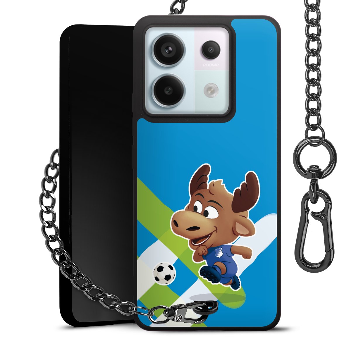 Die Handyhülle verfügt über eine mittig am unteren Rand platzierte Öse, an der die Metallkette stabil befestigt ist. Bestelle die Hülle einfach für Dein Smartphone-Modell, dann passt sie wie angegossen und Du brauchst sie bloß einmal anzudrücken. Handy in die Tasche, Karabiner an den Hosenbund – schon kann die Party starten.