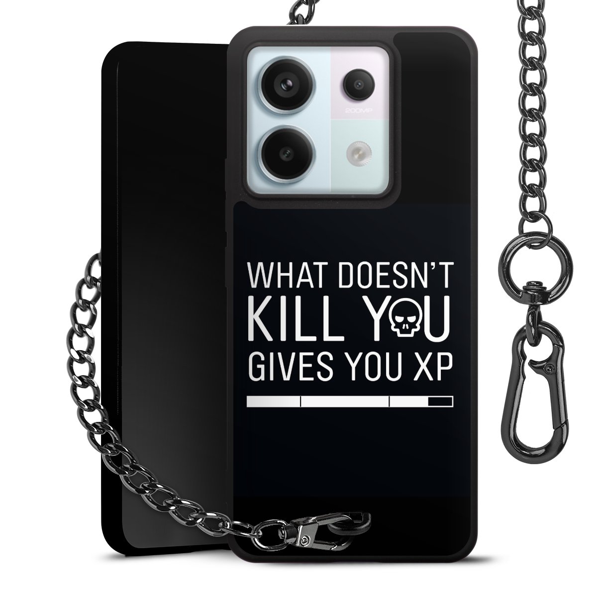 Die mattschwarze Silikon-Handyhülle besteht aus robustem TPU (thermoplastisches Polyurethan). Sie ist flexibel und schützt Dein Smartphone vor Stößen und Kratzern. Die Kette sowie der Karabinerhaken sind aus Metall in Gunmetal-Optik gefertigt. Für dieses Produkt kommen ausschließlich TÜV-geprüfte Materialien zum Einsatz.