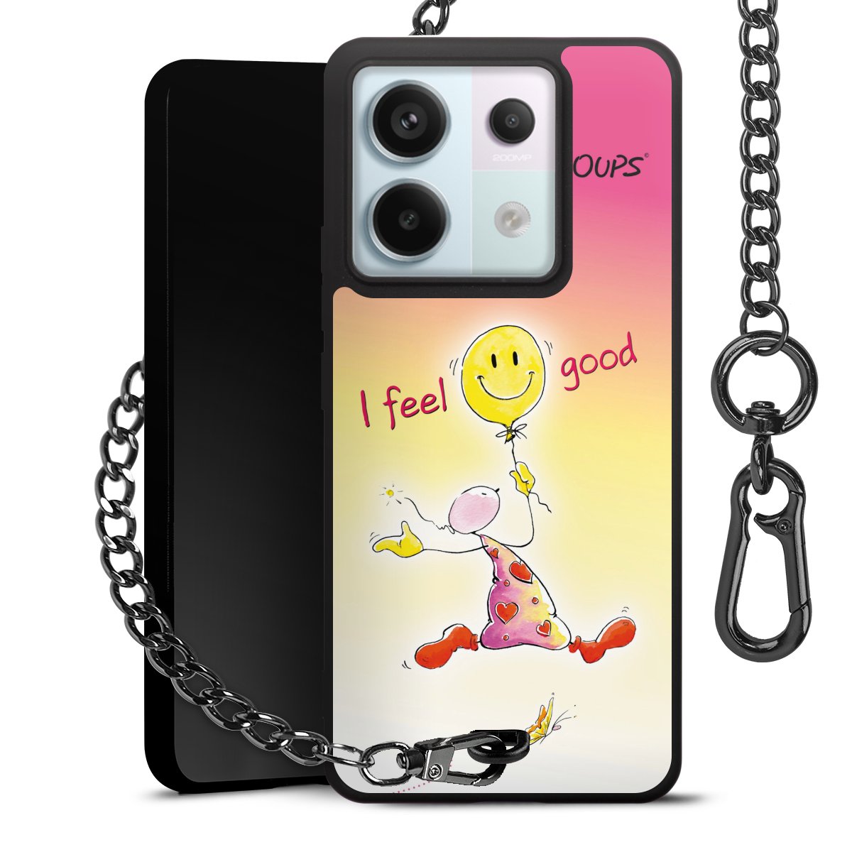 Die Handyhülle verfügt über eine mittig am unteren Rand platzierte Öse, an der die Metallkette stabil befestigt ist. Bestelle die Hülle einfach für Dein Smartphone-Modell, dann passt sie wie angegossen und Du brauchst sie bloß einmal anzudrücken. Handy in die Tasche, Karabiner an den Hosenbund – schon kann die Party starten.