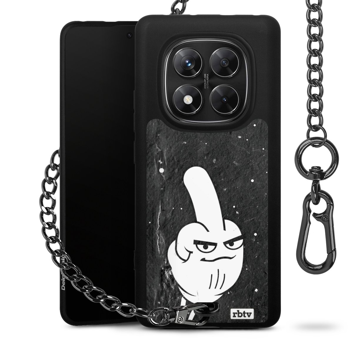 Die mattschwarze Silikon-Handyhülle besteht aus robustem TPU (thermoplastisches Polyurethan). Sie ist flexibel und schützt Dein Smartphone vor Stößen und Kratzern. Die Kette sowie der Karabinerhaken sind aus Metall in Gunmetal-Optik gefertigt. Für dieses Produkt kommen ausschließlich TÜV-geprüfte Materialien zum Einsatz.
