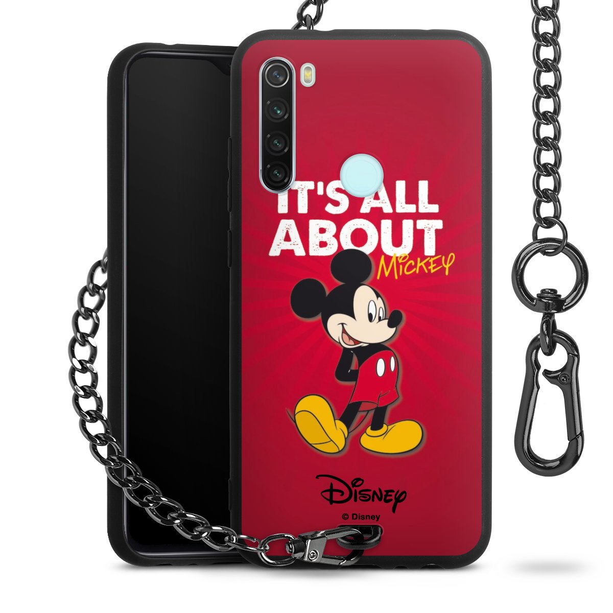 Die Handyhülle verfügt über eine mittig am unteren Rand platzierte Öse, an der die Metallkette stabil befestigt ist. Bestelle die Hülle einfach für Dein Smartphone-Modell, dann passt sie wie angegossen und Du brauchst sie bloß einmal anzudrücken. Handy in die Tasche, Karabiner an den Hosenbund – schon kann die Party starten.