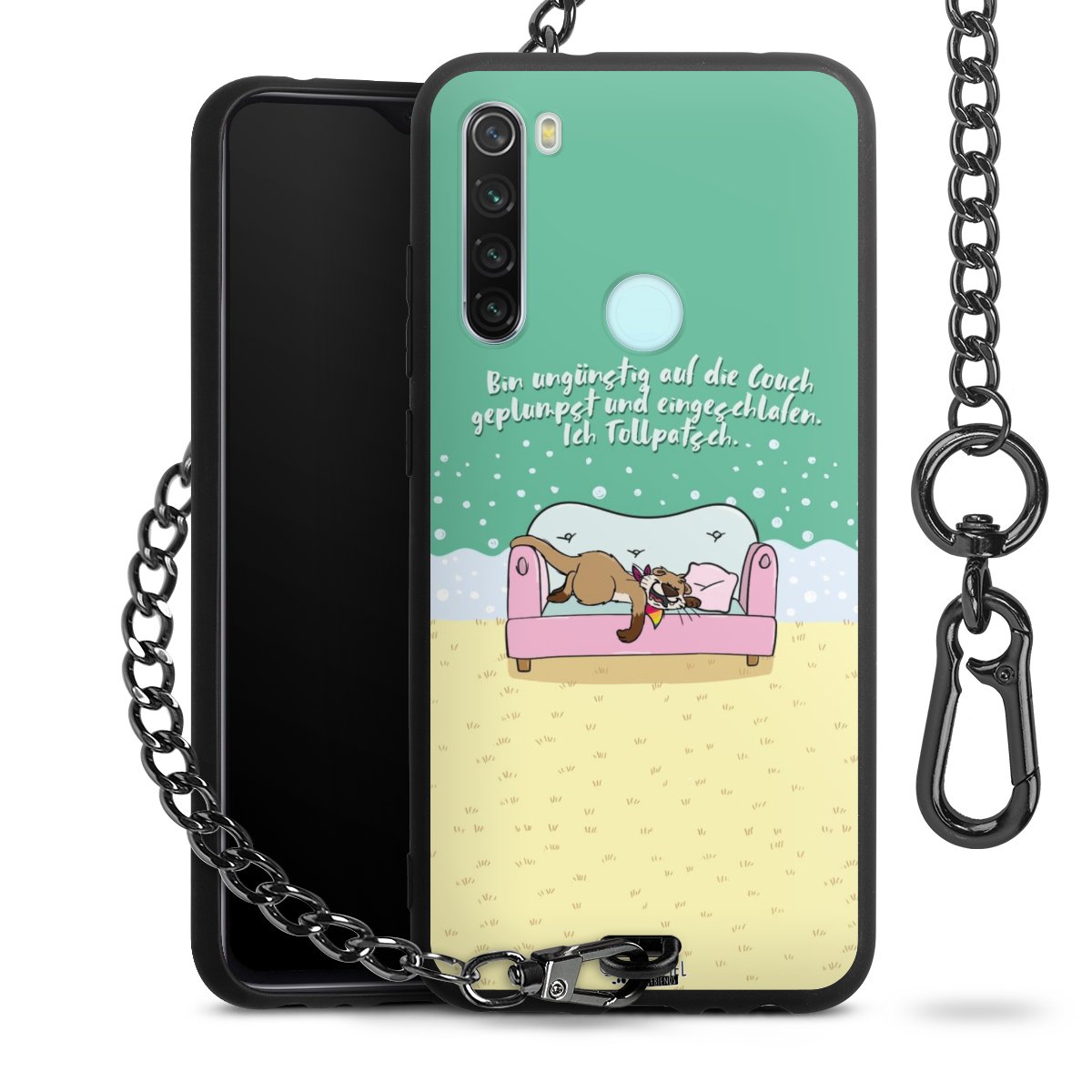 Die mattschwarze Silikon-Handyhülle besteht aus robustem TPU (thermoplastisches Polyurethan). Sie ist flexibel und schützt Dein Smartphone vor Stößen und Kratzern. Die Kette sowie der Karabinerhaken sind aus Metall in Gunmetal-Optik gefertigt. Für dieses Produkt kommen ausschließlich TÜV-geprüfte Materialien zum Einsatz.