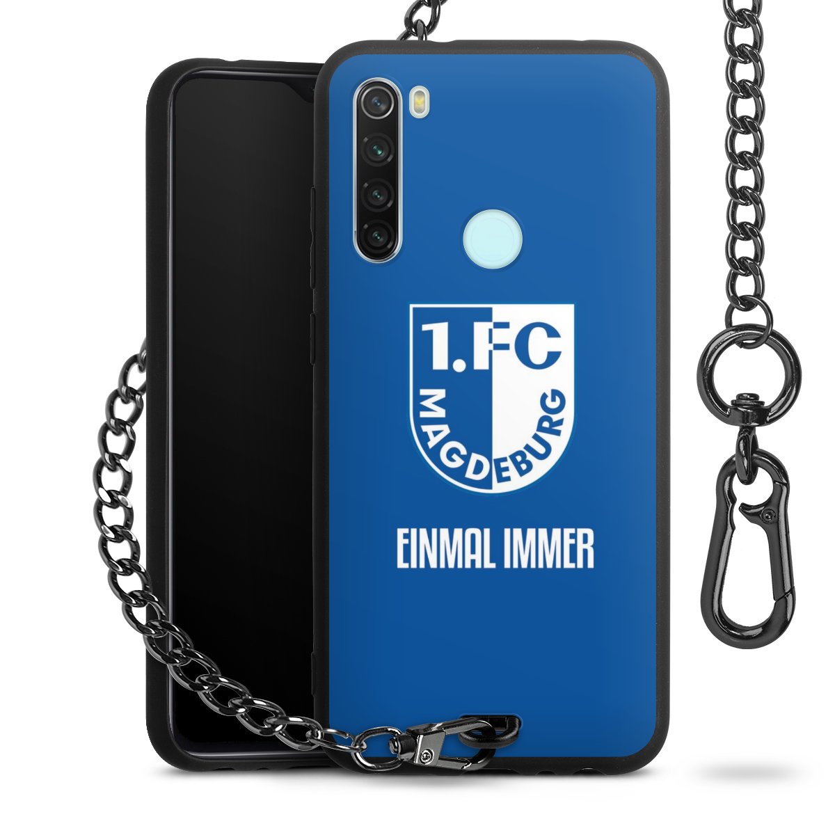 Die Handyhülle verfügt über eine mittig am unteren Rand platzierte Öse, an der die Metallkette stabil befestigt ist. Bestelle die Hülle einfach für Dein Smartphone-Modell, dann passt sie wie angegossen und Du brauchst sie bloß einmal anzudrücken. Handy in die Tasche, Karabiner an den Hosenbund – schon kann die Party starten.