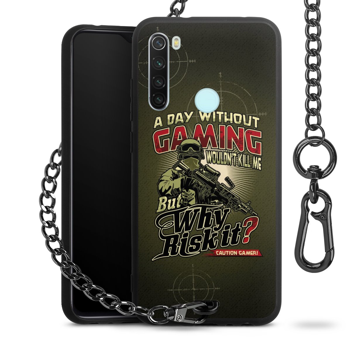 Die mattschwarze Silikon-Handyhülle besteht aus robustem TPU (thermoplastisches Polyurethan). Sie ist flexibel und schützt Dein Smartphone vor Stößen und Kratzern. Die Kette sowie der Karabinerhaken sind aus Metall in Gunmetal-Optik gefertigt. Für dieses Produkt kommen ausschließlich TÜV-geprüfte Materialien zum Einsatz.