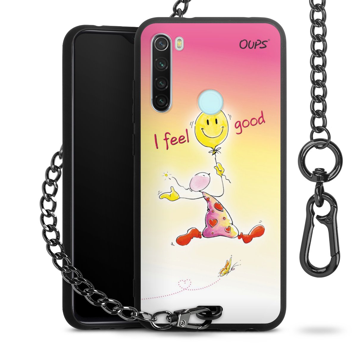 Die Handyhülle verfügt über eine mittig am unteren Rand platzierte Öse, an der die Metallkette stabil befestigt ist. Bestelle die Hülle einfach für Dein Smartphone-Modell, dann passt sie wie angegossen und Du brauchst sie bloß einmal anzudrücken. Handy in die Tasche, Karabiner an den Hosenbund – schon kann die Party starten.