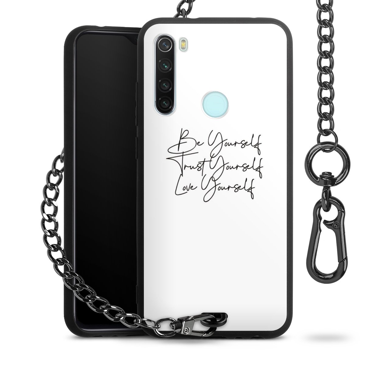 Die mattschwarze Silikon-Handyhülle besteht aus robustem TPU (thermoplastisches Polyurethan). Sie ist flexibel und schützt Dein Smartphone vor Stößen und Kratzern. Die Kette sowie der Karabinerhaken sind aus Metall in Gunmetal-Optik gefertigt. Für dieses Produkt kommen ausschließlich TÜV-geprüfte Materialien zum Einsatz.