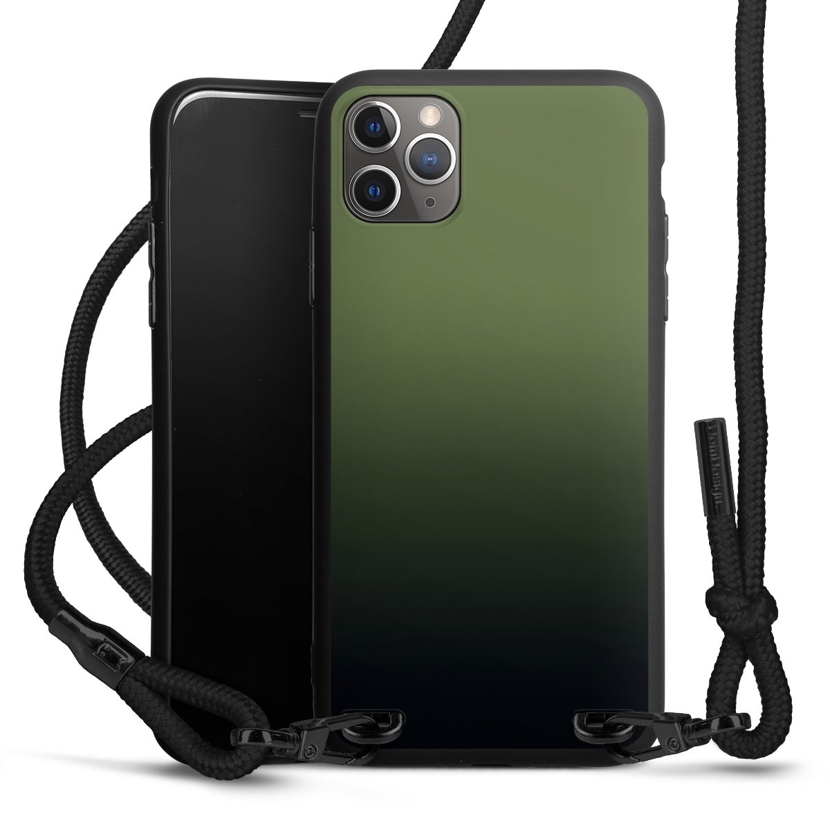 Pure Black: Handyhülle, Stoffband und Metalldetails in stylischem Mattschwarz.