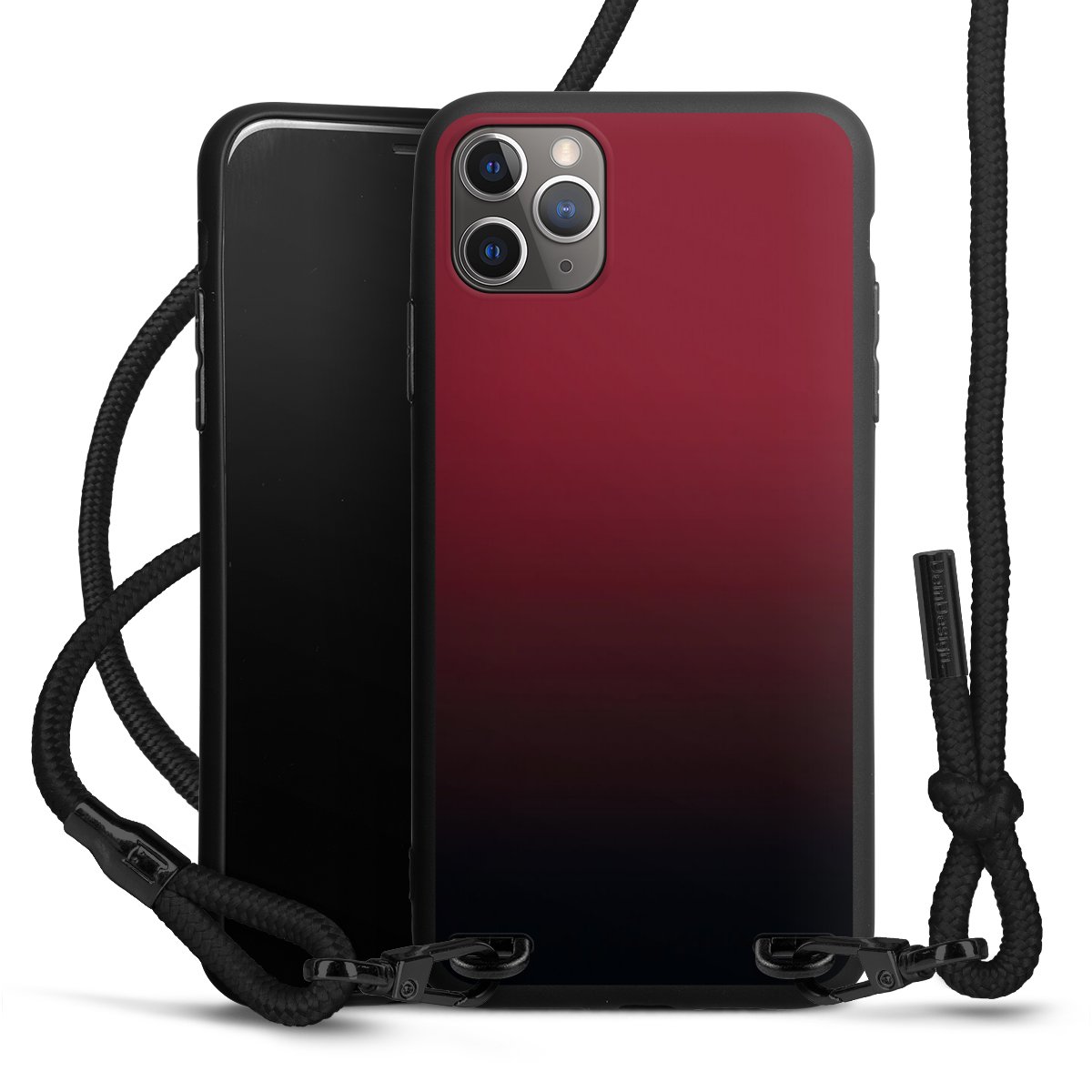 Pure Black: Handyhülle, Stoffband und Metalldetails in stylischem Mattschwarz.
