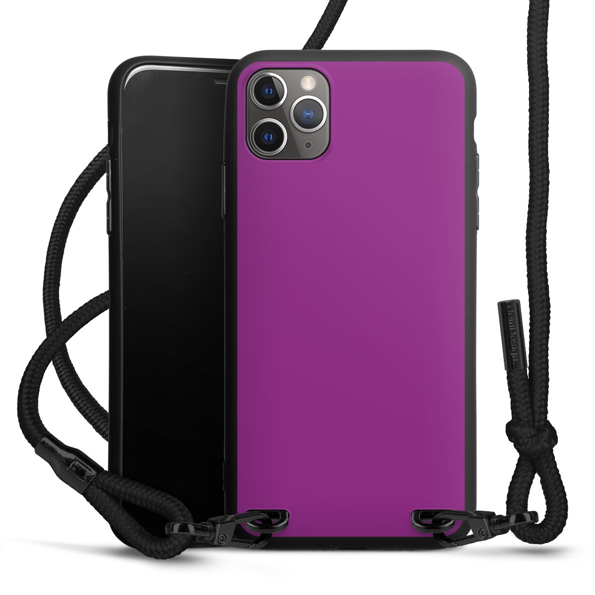 Pure Black: Handyhülle, Stoffband und Metalldetails in stylischem Mattschwarz.
