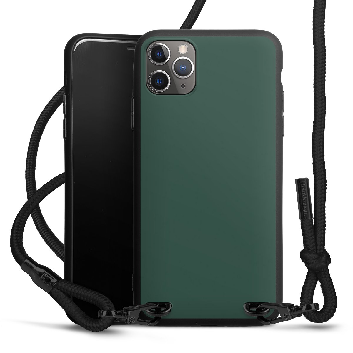 Pure Black: Handyhülle, Stoffband und Metalldetails in stylischem Mattschwarz.