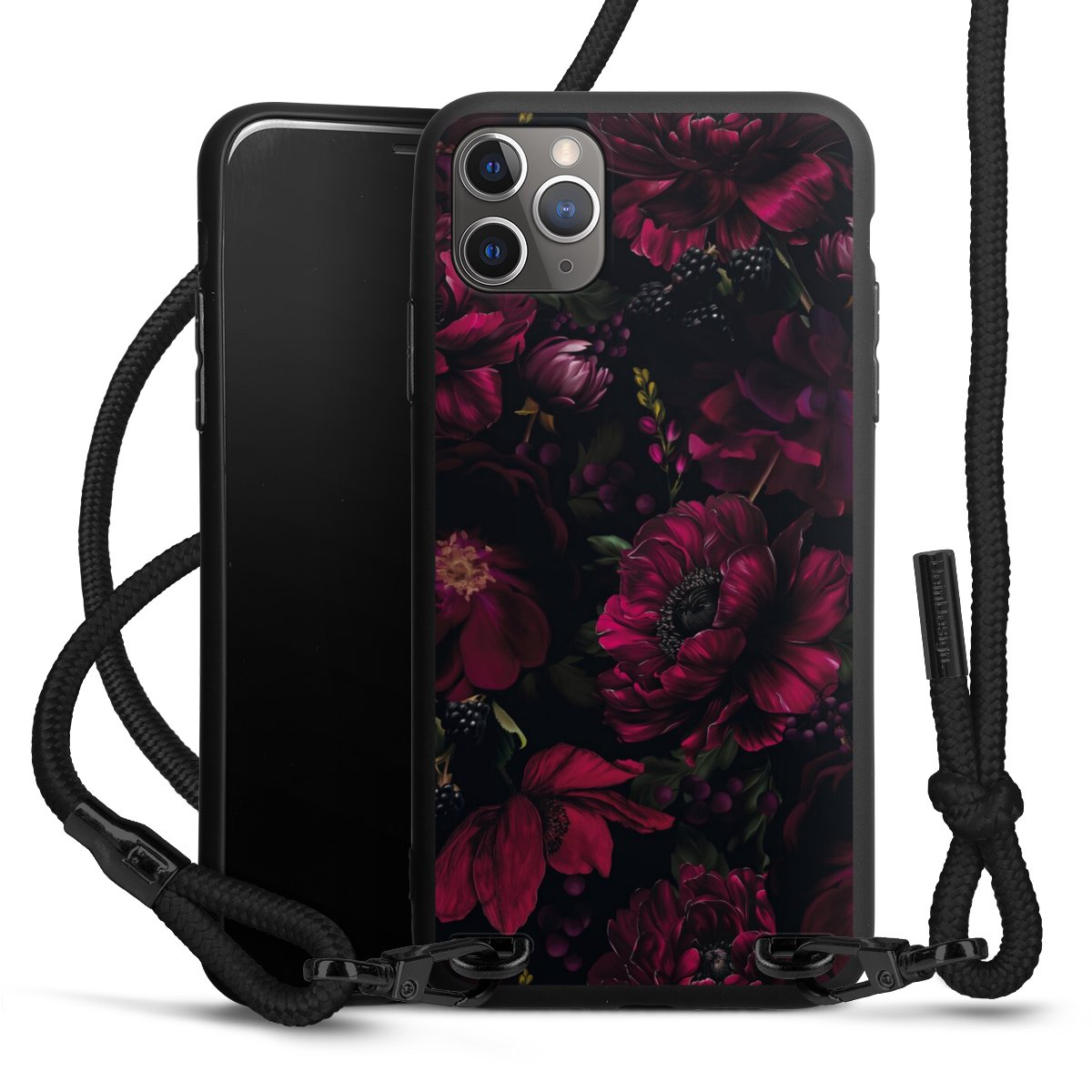 Pure Black: Handyhülle, Stoffband und Metalldetails in stylischem Mattschwarz.