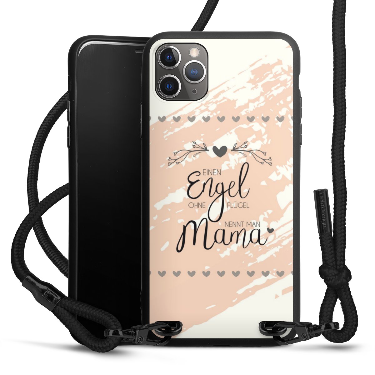 Pure Black: Handyhülle, Stoffband und Metalldetails in stylischem Mattschwarz.