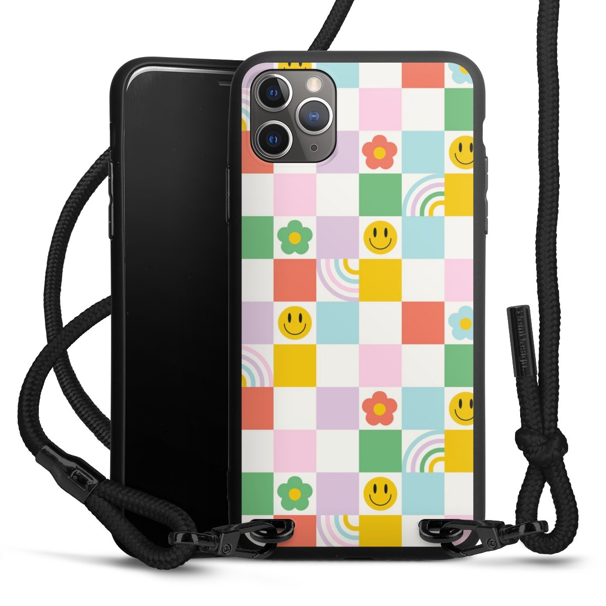 Pure Black: Handyhülle, Stoffband und Metalldetails in stylischem Mattschwarz.