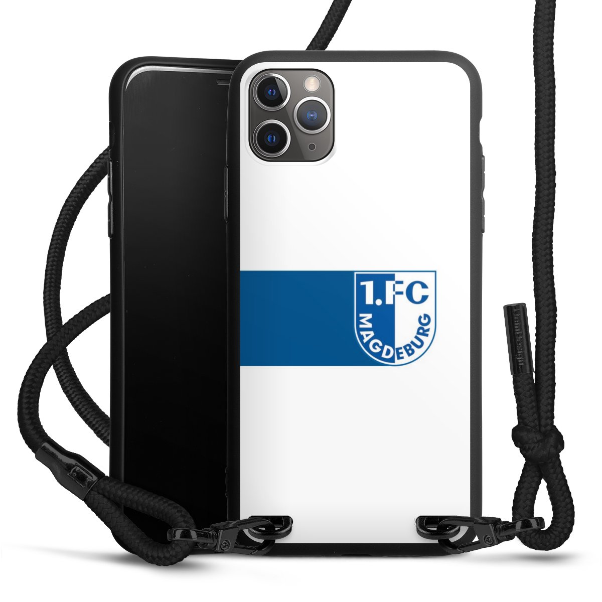 Pure Black: Handyhülle, Stoffband und Metalldetails in stylischem Mattschwarz.