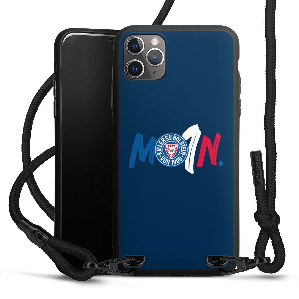 Pure Black: Handyhülle, Stoffband und Metalldetails in stylischem Mattschwarz.