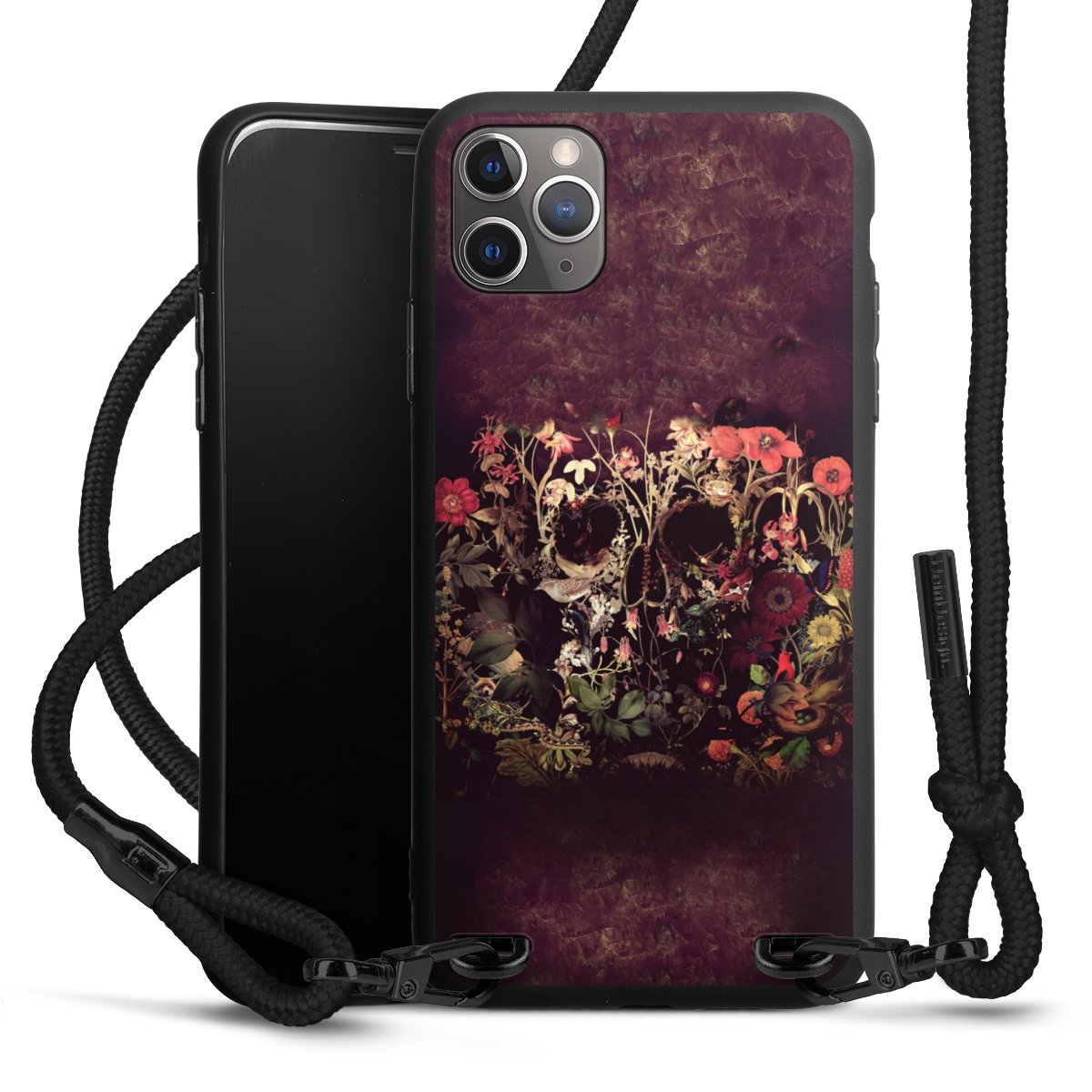 Pure Black: Handyhülle, Stoffband und Metalldetails in stylischem Mattschwarz.