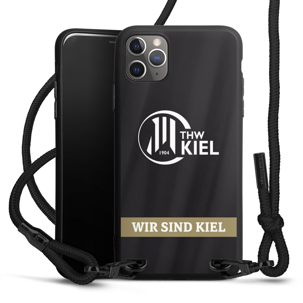 Pure Black: Handyhülle, Stoffband und Metalldetails in stylischem Mattschwarz.