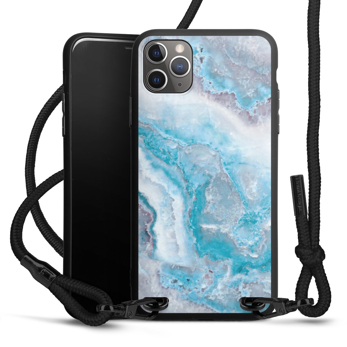 Pure Black: Handyhülle, Stoffband und Metalldetails in stylischem Mattschwarz.