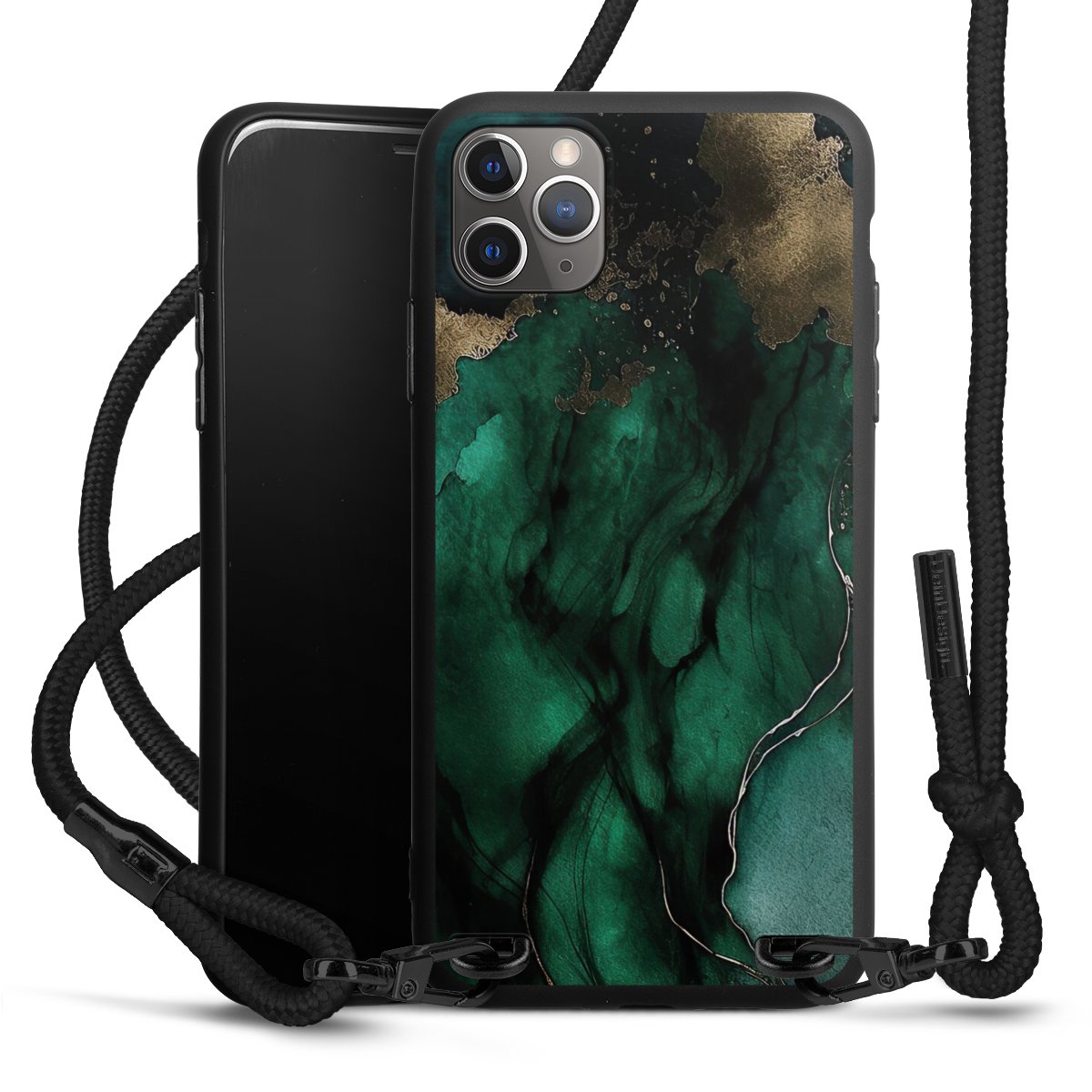 Pure Black: Handyhülle, Stoffband und Metalldetails in stylischem Mattschwarz.