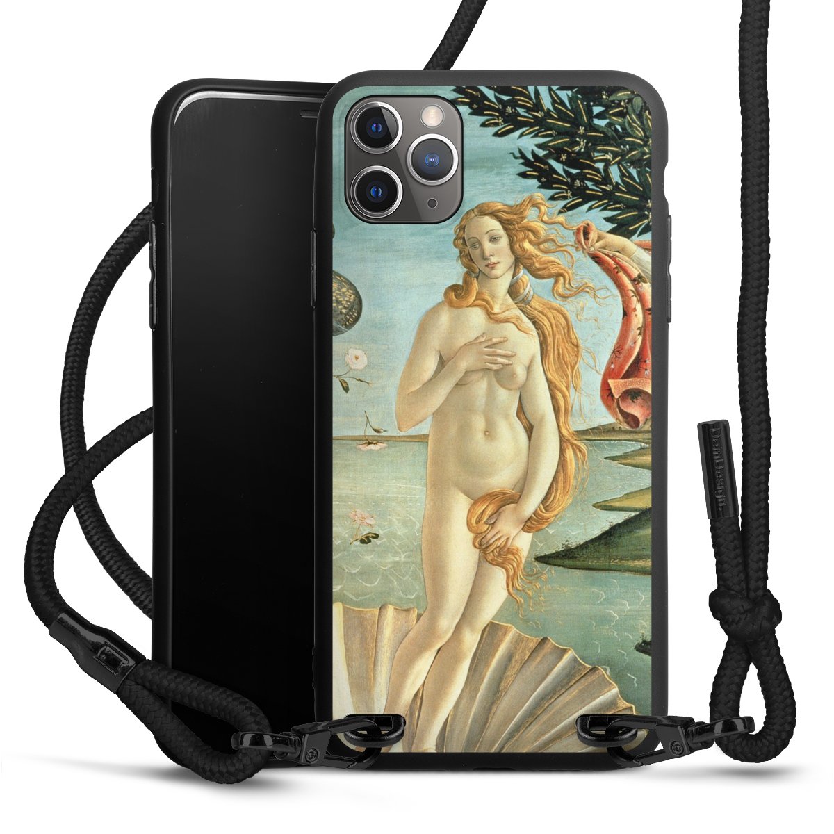 Pure Black: Handyhülle, Stoffband und Metalldetails in stylischem Mattschwarz.
