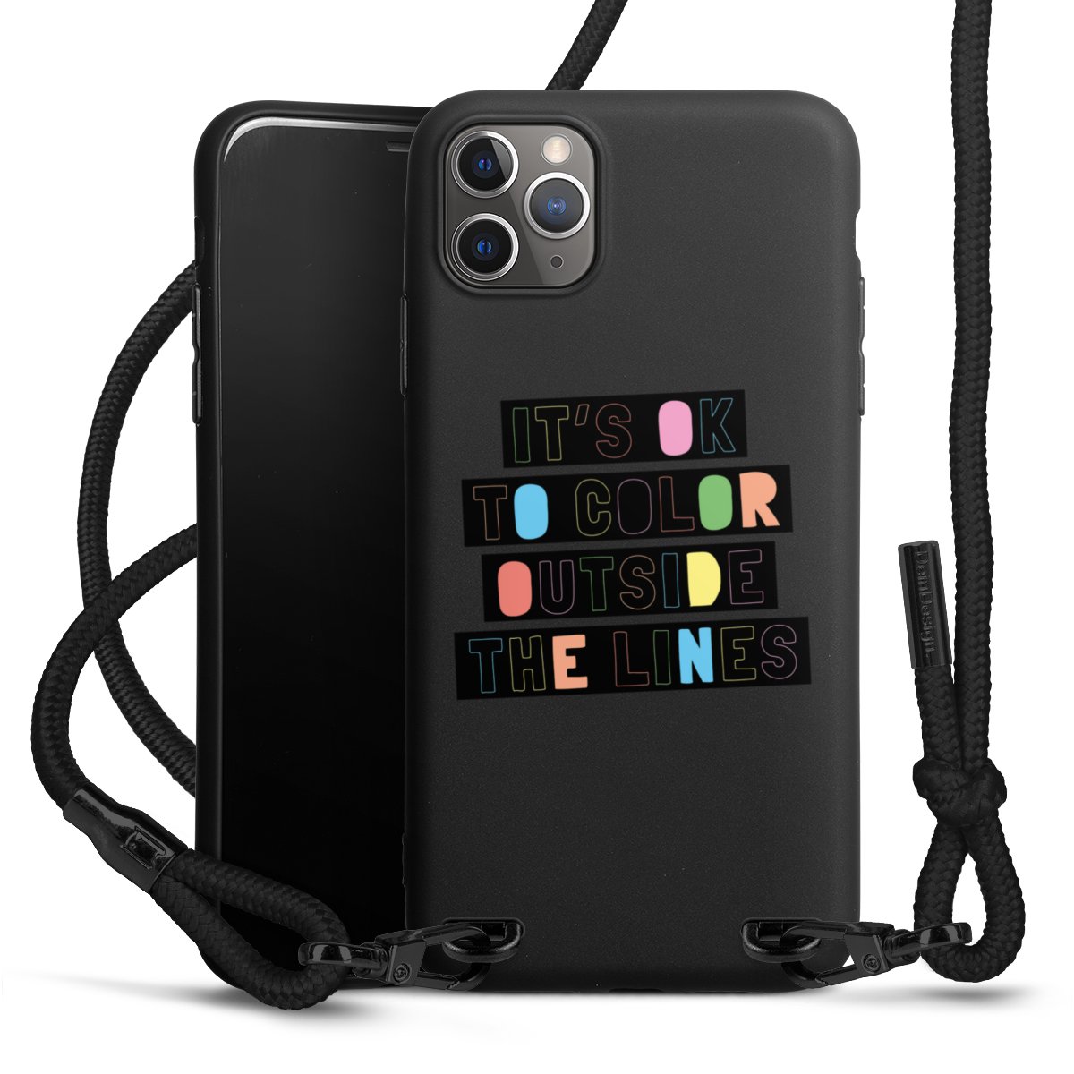 Pure Black: Handyhülle, Stoffband und Metalldetails in stylischem Mattschwarz.