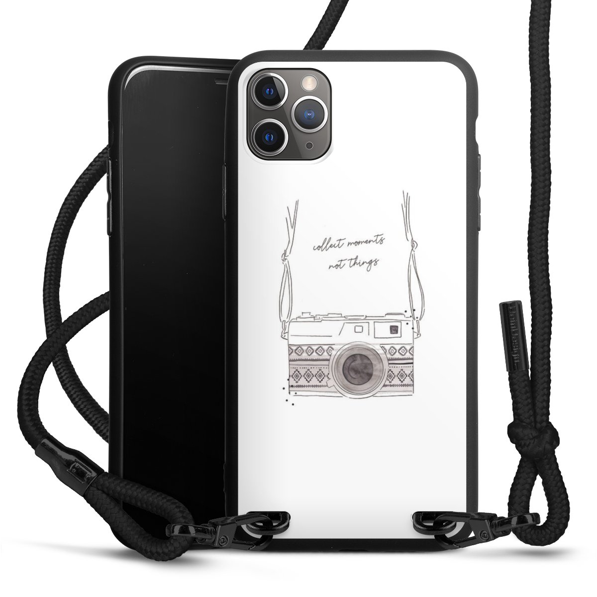 Pure Black: Handyhülle, Stoffband und Metalldetails in stylischem Mattschwarz.