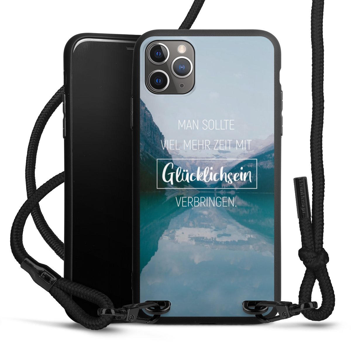 Pure Black: Handyhülle, Stoffband und Metalldetails in stylischem Mattschwarz.