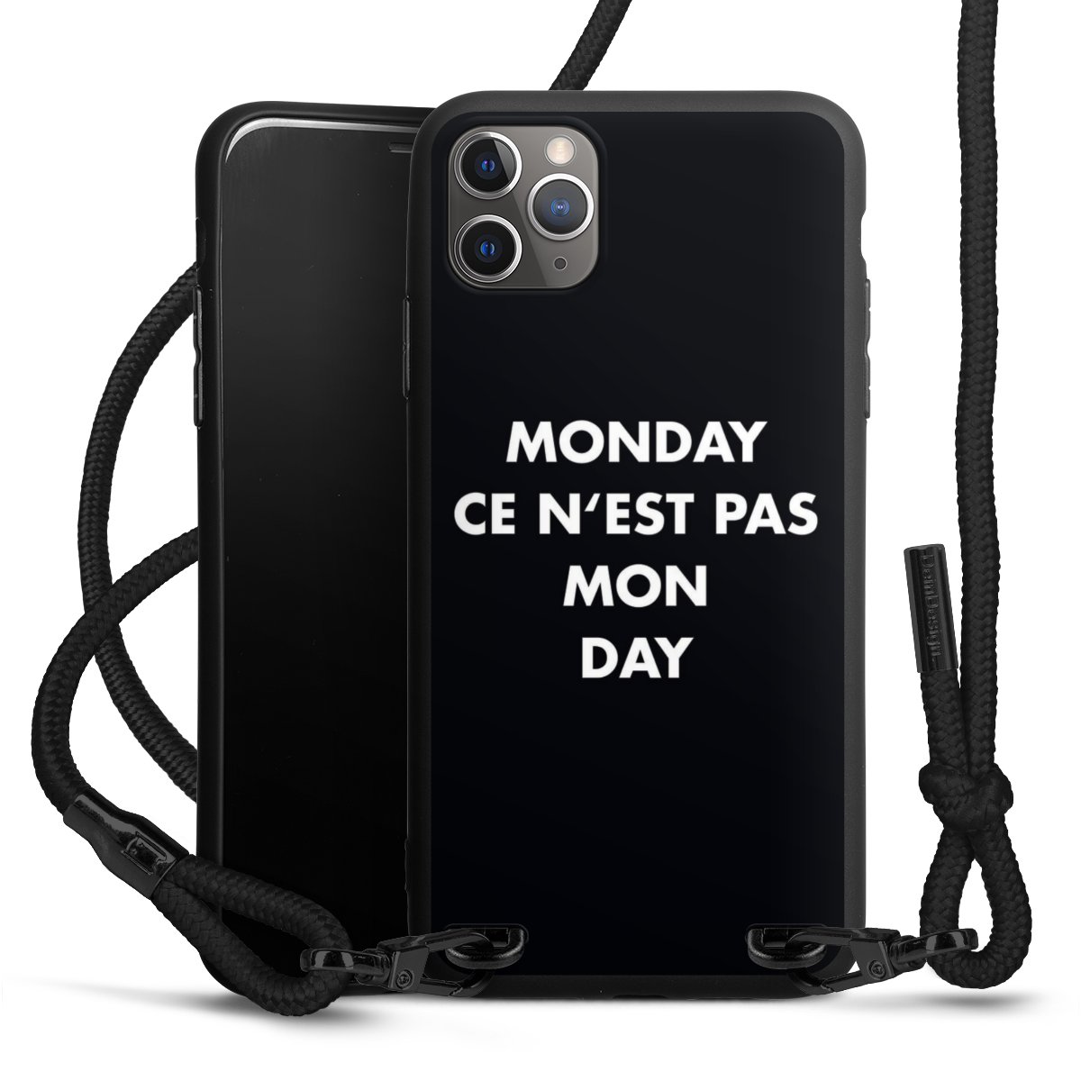 Pure Black: Handyhülle, Stoffband und Metalldetails in stylischem Mattschwarz.
