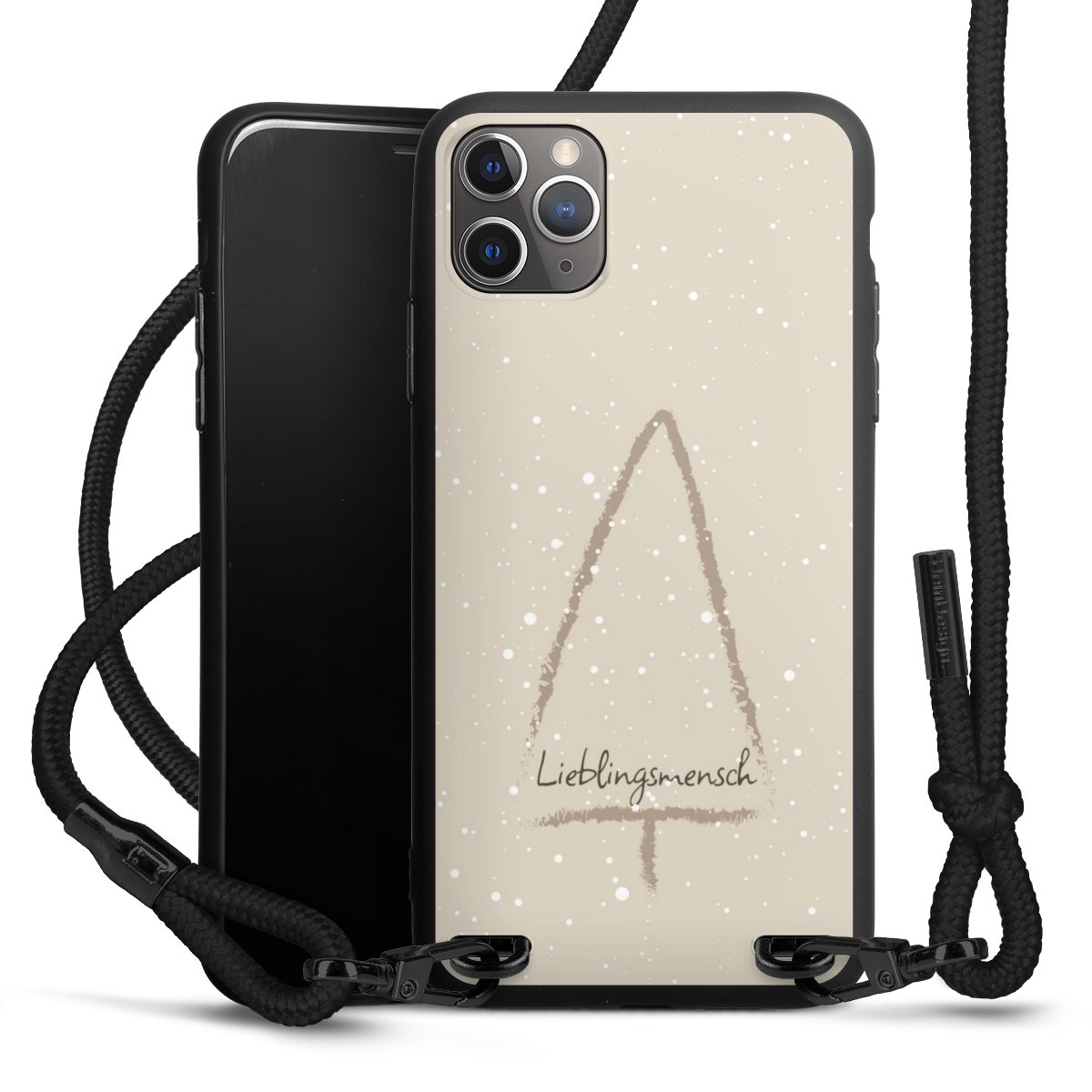 Pure Black: Handyhülle, Stoffband und Metalldetails in stylischem Mattschwarz.