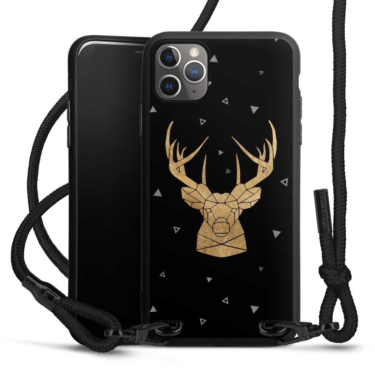 Pure Black: Handyhülle, Stoffband und Metalldetails in stylischem Mattschwarz.