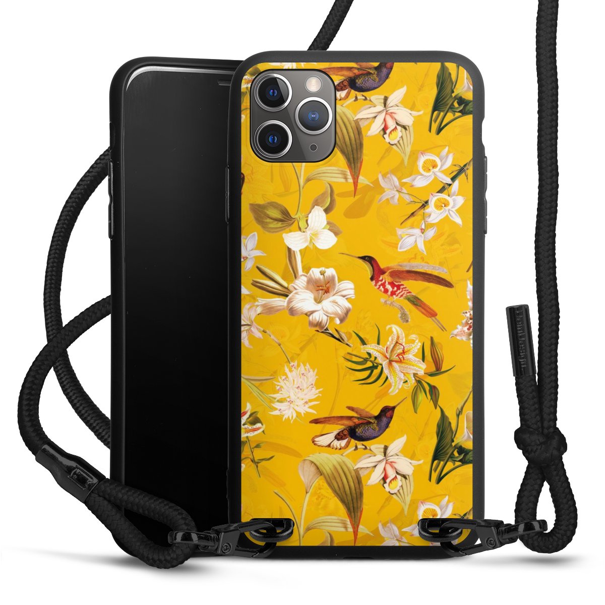 Pure Black: Handyhülle, Stoffband und Metalldetails in stylischem Mattschwarz.