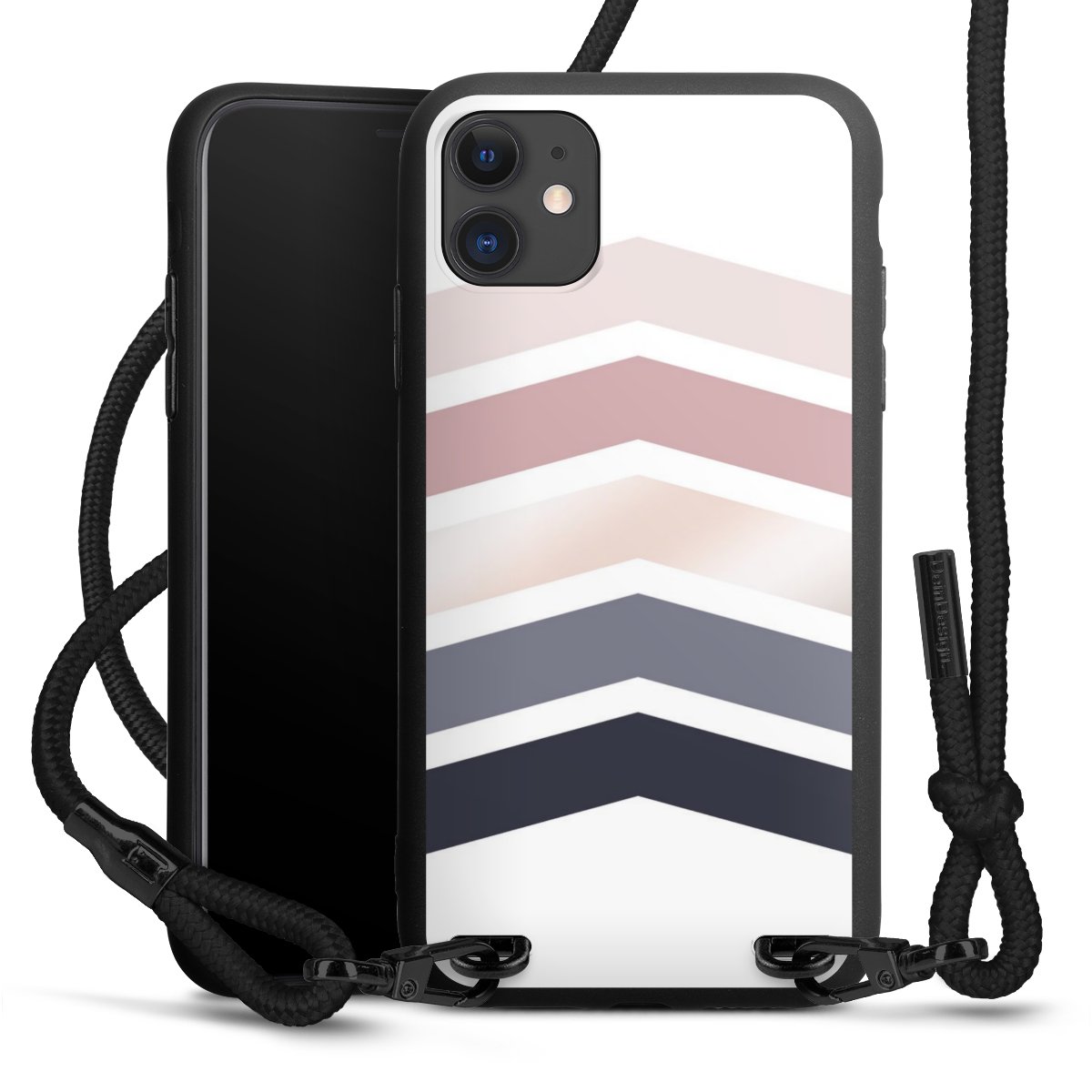 Pure Black: Handyhülle, Stoffband und Metalldetails in stylischem Mattschwarz.