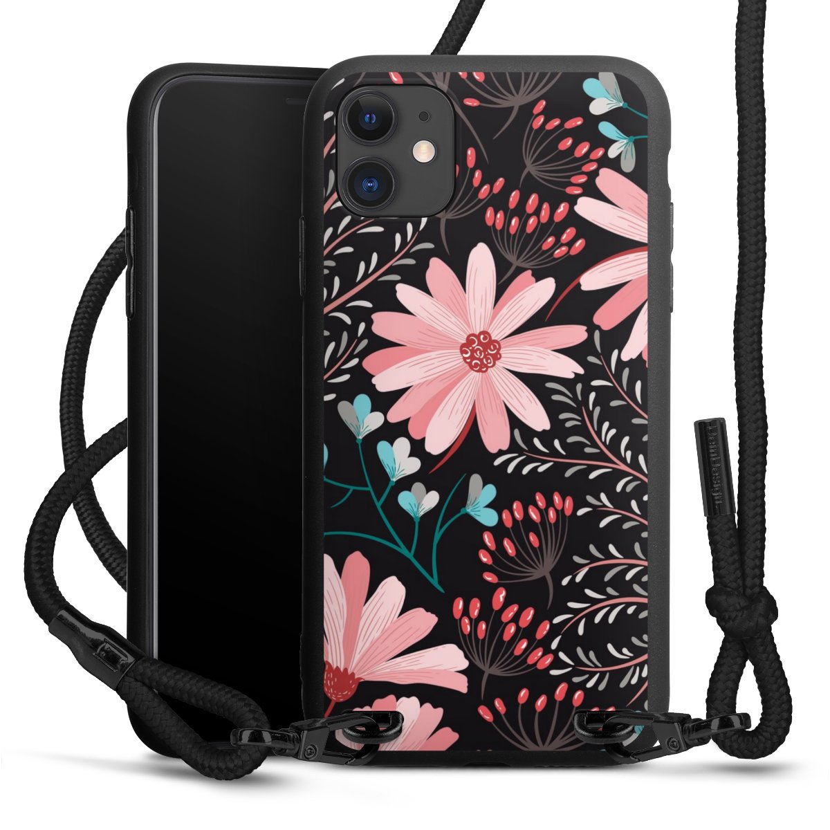 Pure Black: Handyhülle, Stoffband und Metalldetails in stylischem Mattschwarz.