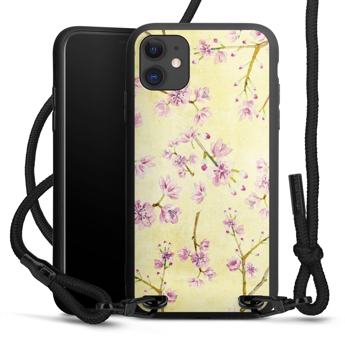 Pure Black: Handyhülle, Stoffband und Metalldetails in stylischem Mattschwarz.