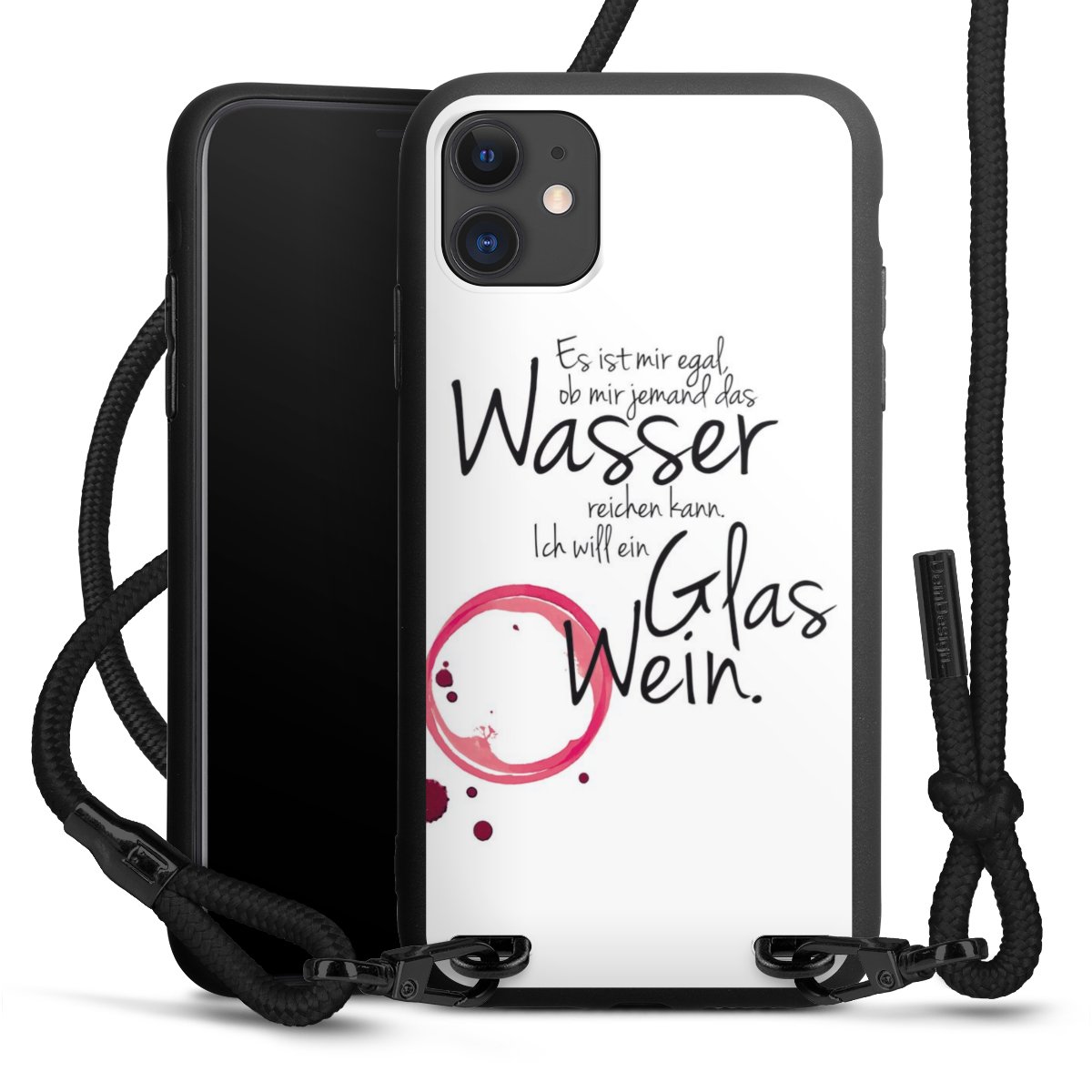Pure Black: Handyhülle, Stoffband und Metalldetails in stylischem Mattschwarz.