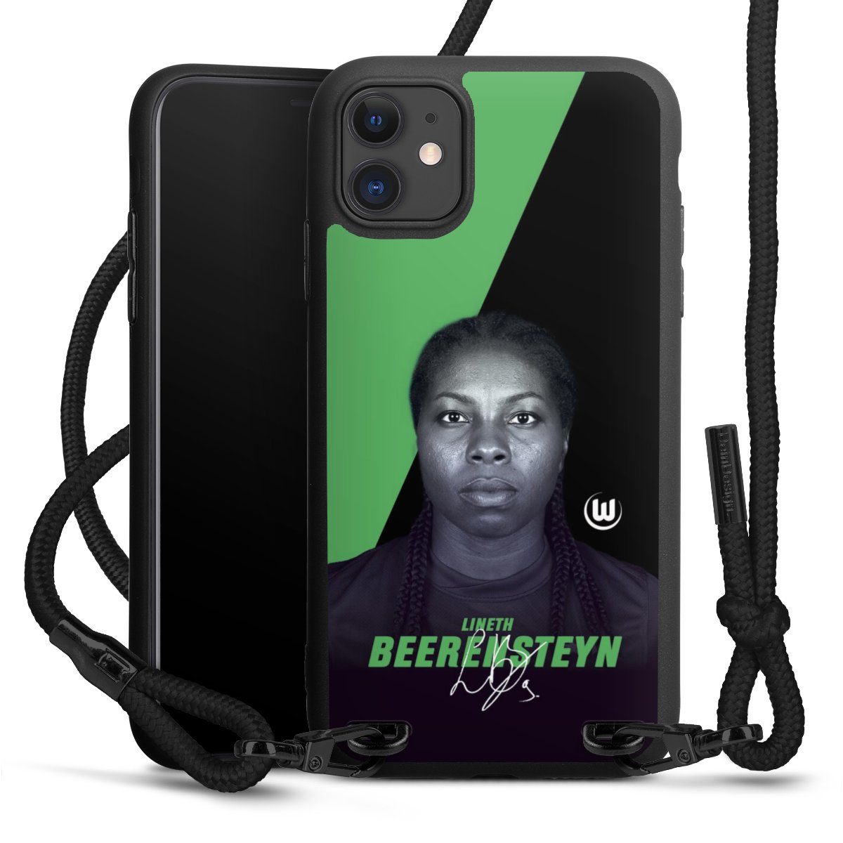 Pure Black: Handyhülle, Stoffband und Metalldetails in stylischem Mattschwarz.