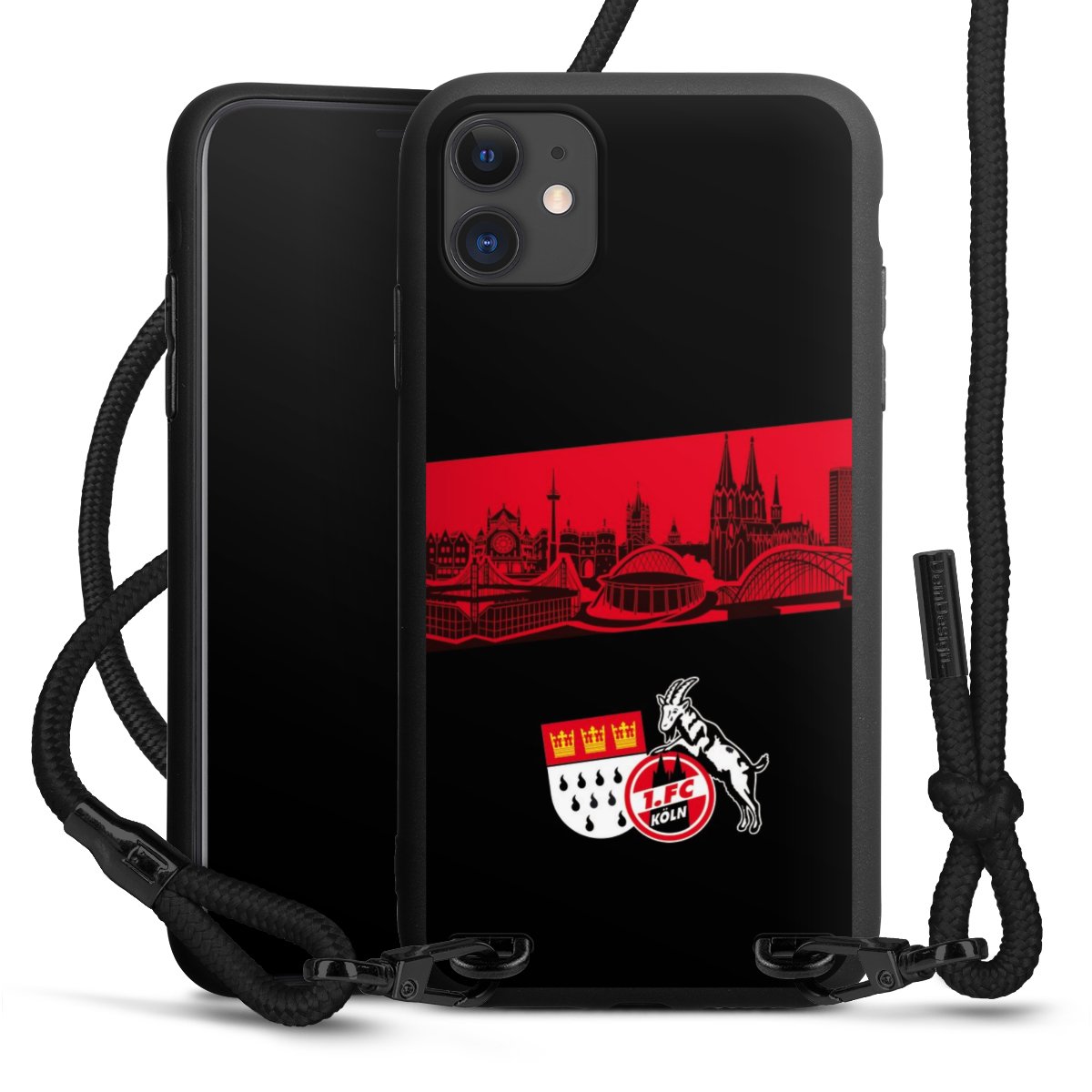 Pure Black: Handyhülle, Stoffband und Metalldetails in stylischem Mattschwarz.